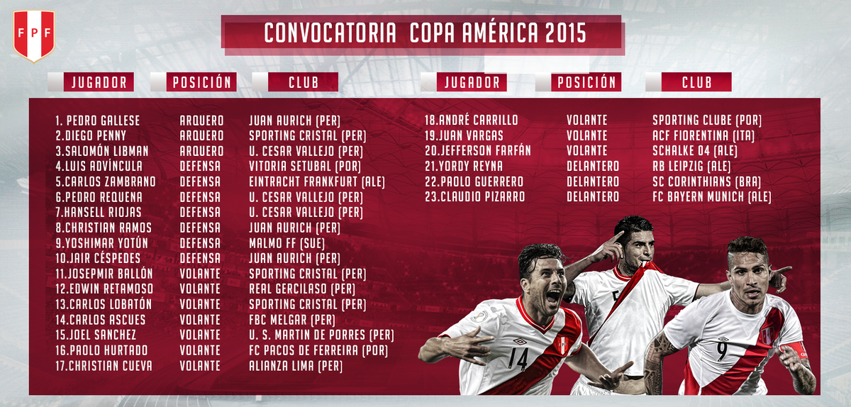 Como se anticipaba, Perú presentará sorpresas en el certamen continental. El defensa de la Universidad César Vallejo, Pedro Requena, es la novedad en la zaga trasera. Por otro lado, la mayor novedad del equipo peruano se encuentra en la convocatoria del volante de Alianza Lima Christian Cueva. El mediocampista 'grone', pese a encontrarse en fechas de suspensión, fue tomado en cuenta por director técnico.