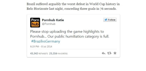 Em virtude do excesso de vídeos, o site Pornhub publicou o seguinte pedido: "Por favor, parem de publicar vídeos no Pornhub com os melhores momentos do jogo Brasil x Alemanha. Nossa categoria "humilhação pública" já está lotada".
