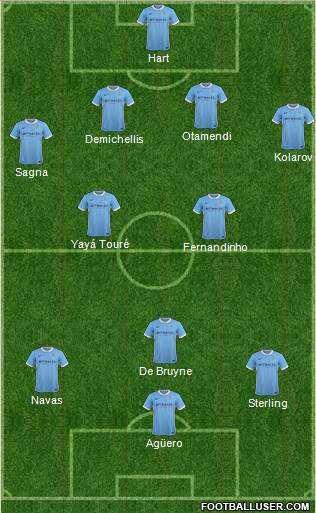 Pellegrini intende valutare fino all'ultimo alcuni acciaccati di lusso. Meno dubbi qui sullo schieramento tattico. 4-2-3-1 consueto, con terminale ultimo Aguero. Alle spalle del Kun, linea di assoluta qualità, Navas - De Bruyne - Sterling. Yaya Tourè e Fernandinho a proteggere la difesa dei blu di Manchester. Dietro, con Kompany limitato dal problema occorso in Nazionale, occasione per il vecchio Demichelis al fianco di Otamendi. Esterni bassi Zabaleta (Sagna) e Kolarov, in porta Hart. In caso di avanzamento di Yaya Tourè, dentro Delph nel mezzo e panca per Navas.
