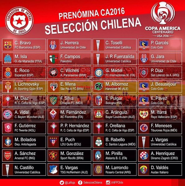 El técnico de la selección chilena, Juan Antonio Pizzi, entregó la prénomina de jugadores que podrían jugar la próxima Copa América Centenario 2016. El entrenador argentino llamó a 40 futbolistas en una primera lista que terminará en 23 seleccionados para jugar la cita continental.