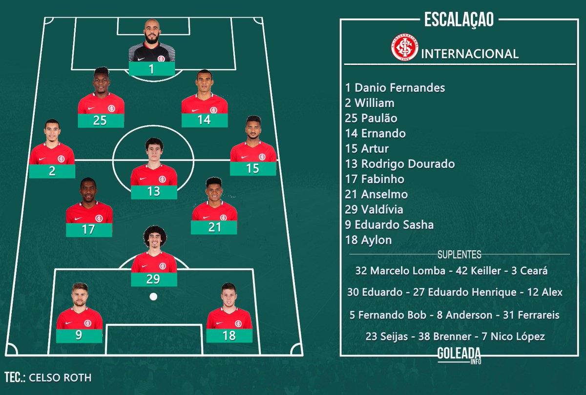 #Internacional - Danilo Fernandes; William, Paulão, Ernando e Artur; Rodrigo Dourado, Fabinho, Anselmo e Valdívia; Eduardo Sasha e Aylon